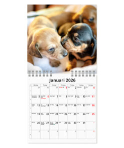 Väggkalender Hundar mini 2025 med tolv bilder på söta hundar. Det är den perfekta väggalmanackan för hundälskare med andra ord. Kalendern har formatet 160 gånger 160 millimeter.