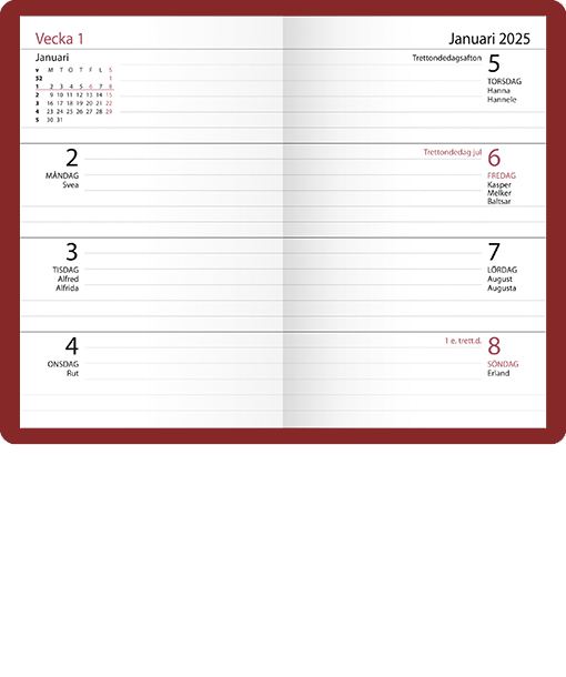 Layout: 1 vecka per uppslag. Radvis över hela uppslaget med månadsöversikt och anteckningsyta överst till vänster.