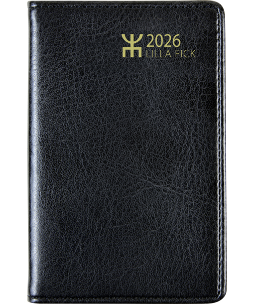 Layout: 1 vecka per uppslag. Radvis över hela uppslaget med månadsöversikt och anteckningsyta överst till vänster.