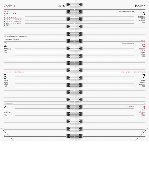Layout: En vecka per uppslag. Med månadsöversikt och anteckningsyta överst till vänster.