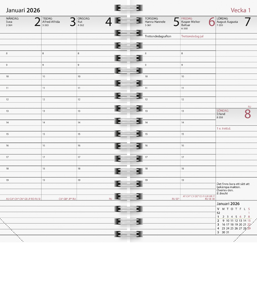 Layout: Kolumnvis, en vecka per uppslag med månadsöversikt i nedre högra hörnet