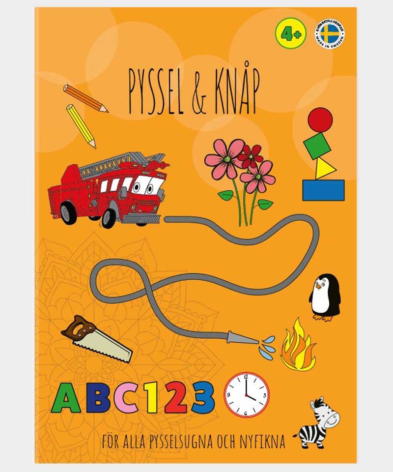 Pyssel & Knåp är en aktivitetsbok som passar många åldrar. De allra minsta kan rita och färglägga och med lite läshjälp så kan de säkert lösa annat pyssel. De äldre barnen kan på ett lekfullt sätt bekanta sig med bokstäver och siffffror och lösa enklare räkneproblem. I Pyssel & Knåp skapar man och lär – 32 sidor med en massa roliga och lärande klurigheter!