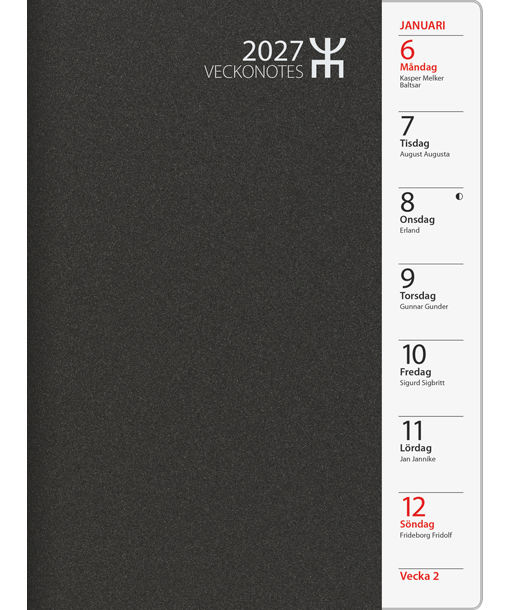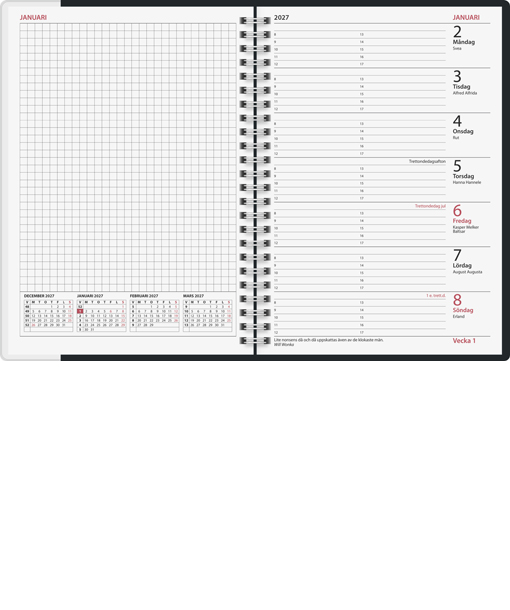 Layout: 1 vecka/ uppslag. Radvis kalendarie med vänstersidan i uppslaget rutad för fria anteckningar
